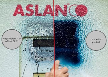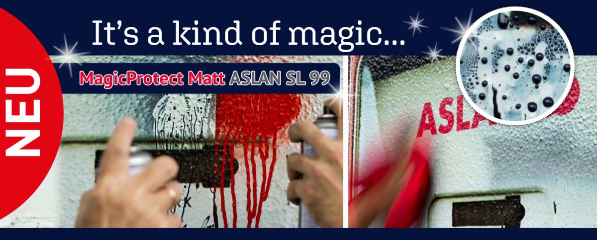 Die Schutzfolie MagicProtect Matt ASLAN SL 99 schützt Digitaldrucke und andere Untergründe zuverlässig vor Vandalismus durch Graffiti und Schmutz. Auf der matten Oberfläche der selbstklebenden Folie perlen Sprühlacke und Schmutz ab wie Wasser von einer Lotusblüte.