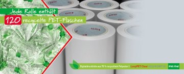 Die transparente, glänzende Digitaldruckfolie. Sie besteht aus recyceltem Polyester (Recyclinganteil 70 %) und ist mit einem wasserbasierenden Kleber ausgestattet. Sie eignet sich für Verklebungen auf ebenen Flächen sowohl im Innen- als auch im Außenbereich und ist mit Latex- und UV-härtenden Tinten bedruckbar. Auch die Außenhaltbarkeit von drei Jahren trägt zum Nachhaltigkeitsbestreben bei.